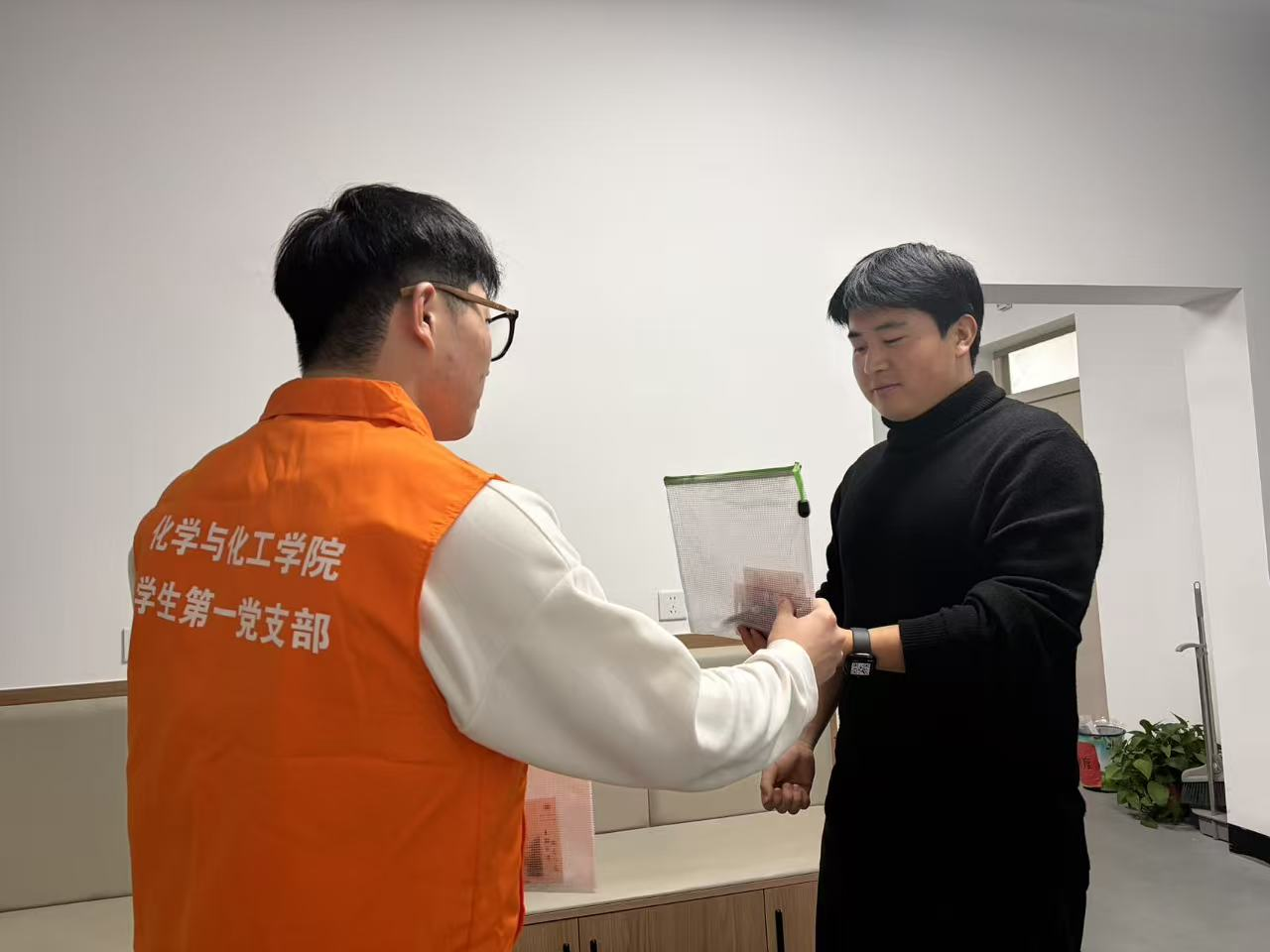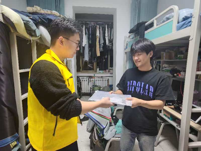 12月19日,学生党员分组行动,深入毕业生宿舍,将满载情谊的暖心礼包送至每一位考研学子手中。走访过程中,党员同学与备考学子亲切交流,细致询问复习进度与生活状况,并叮嘱大家注意劳逸结合、保持平稳心态。他们代表学院送上“一'研'为定”的诚挚祝愿,传递了集体的温暖与支持。收到礼包的同学们纷纷表示,学院的关怀既实用又暖心,有效缓解了备考压力,也让迎考的信心与动力更加坚定。