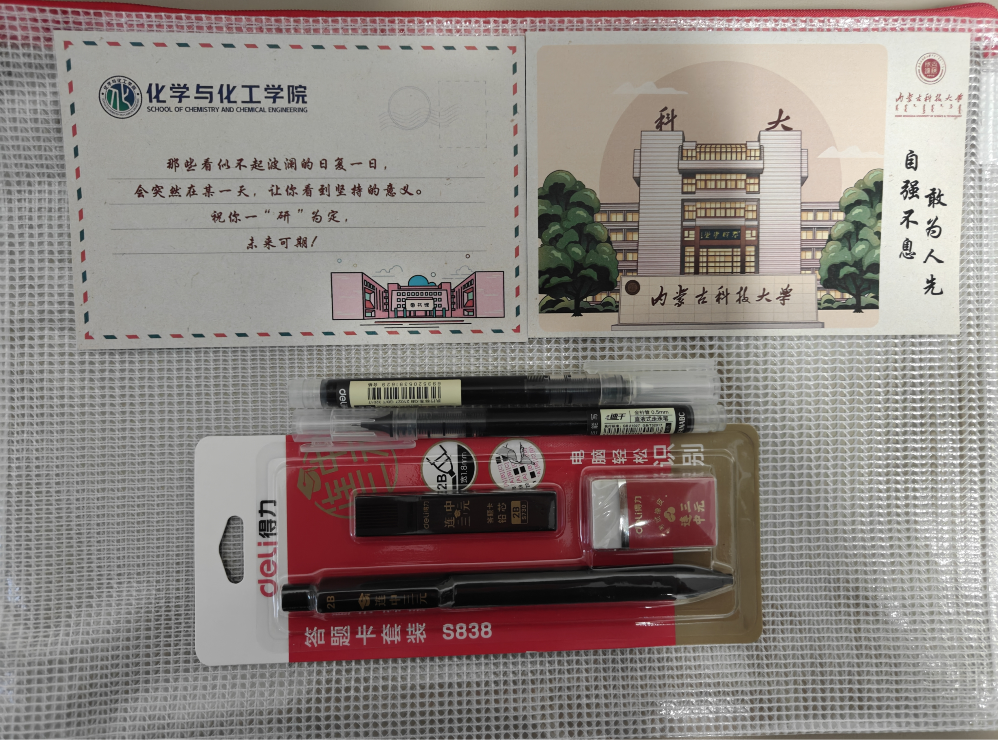 活动筹备阶段,三个学生党支部协同合作,精心准备了实用文具套装,内含黑色签字笔、2B自动铅笔、橡皮及专用笔袋,并附上写满诚挚祝福的鼓励卡片,将学院的关怀与期盼融入字里行间,为考研学子增添一份踏实与信心。