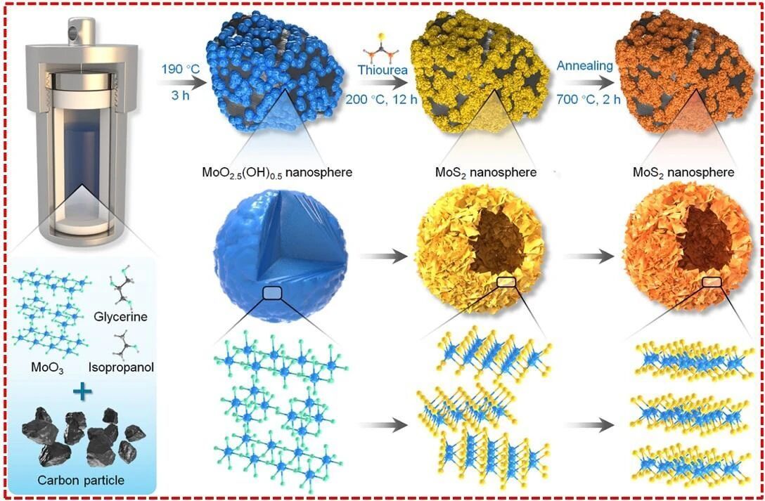 工作五:褐煤衍生碳对二硫化钼空心纳米球储钠性能提升的作用机制研究
